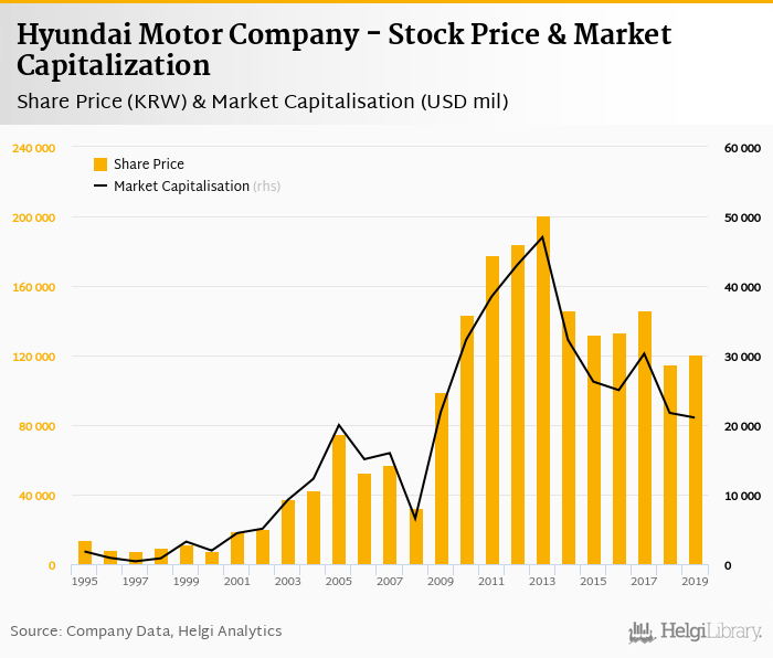 Historically, between 1995 and 2019, the Hyundai Motor Company’s stock price reached a high of KRW 200,714 in 2013 and a low of KRW 7,831 in 1997.