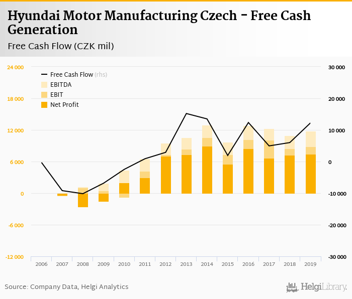 Hyundai Motor Manufacturing Czech made a net profit of CZK 7,387 mil with revenues of CZK 123,140 mil in 2019, up by 2.25% and down by 4.73%, respectively, compared to the previous year. This translates into a net margin of 6.00%.