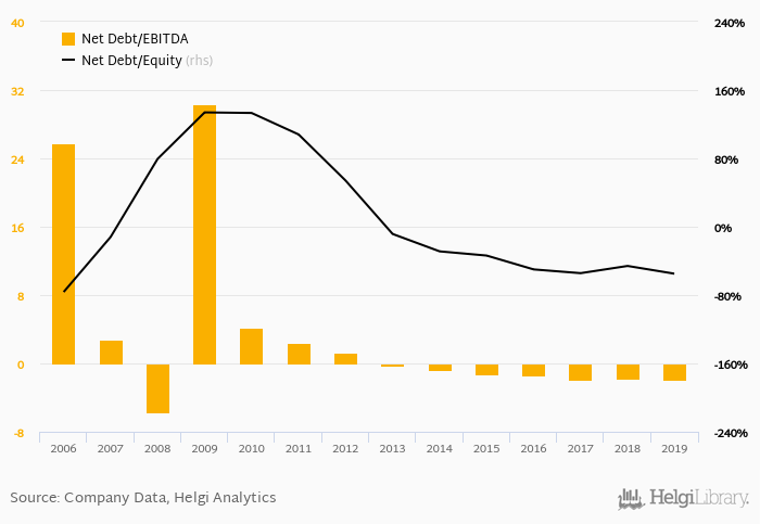 Historically, the firm’s net debt to equity reached a high of 134% in 2009 and a low of -76.4% in 2006 between 2006 and 2019. The average for the last five years was -47.8%.