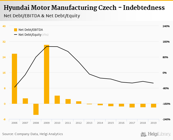 Hyundai Motor Manufacturing Czech's net debt stood at CZK -22,310 mil and accounted for -55.0% of equity at the end of 2019. The ratio is down 9.08 pp compared to the previous year.