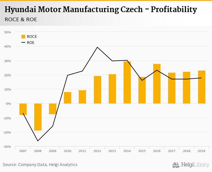 Hyundai Motor Manufacturing Czech made a net profit of CZK 7,387 mil in 2019, up 2.25% compared to the previous year. Historically, between 2006 and 2019, the company's net profit reached a high of CZK 8,973 mil in 2014 and a low of CZK -2,576 mil in 2008.