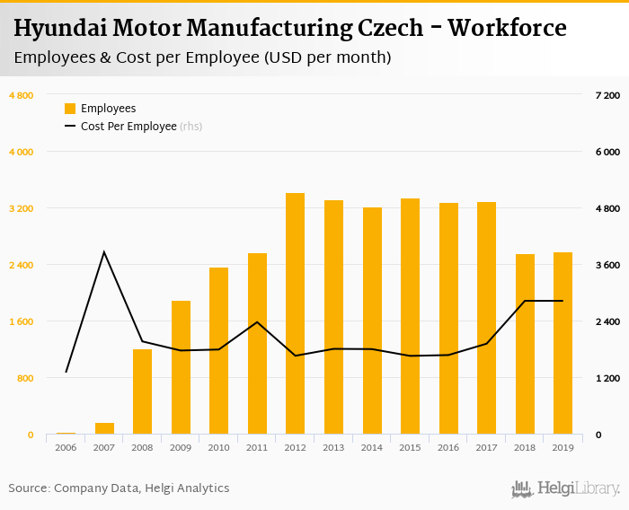 Hyundai Motor Manufacturing Czech employed 2,580 employees in 2019, up 1.1% compared to the previous year. Historically, between 2006 and 2019, the firm's workforce hit a high of 3,415 employees in 2012 and a low of 24.0 employees in 2006.