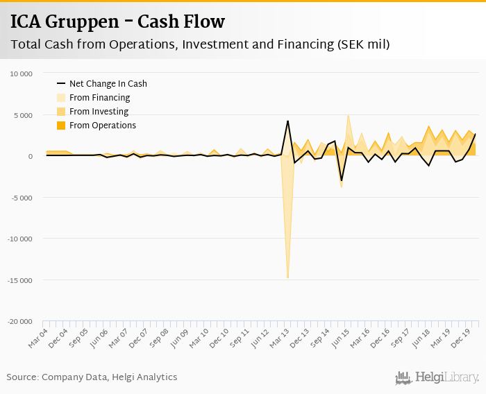 ICA Gruppen's operating cash flow stood at SEK 2,289 mil in 1Q2020, up 47.3% when compared to the previous year. Historically, between 1Q2004 - 1Q2020, the firm’s operating cash flow reached a high of SEK 3,452 mil in 2Q2018 and a low of SEK -301 mil in 1Q2013.
