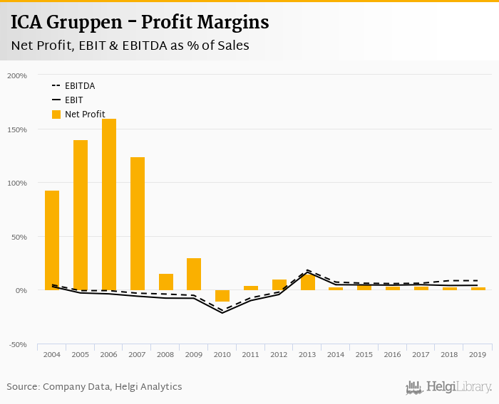 ICA Gruppen made a net profit of SEK 3,432 mil with revenues of SEK 119,295 mil in 2019, down by 1.69% and up by 3.42%, respectively, compared to the previous year.