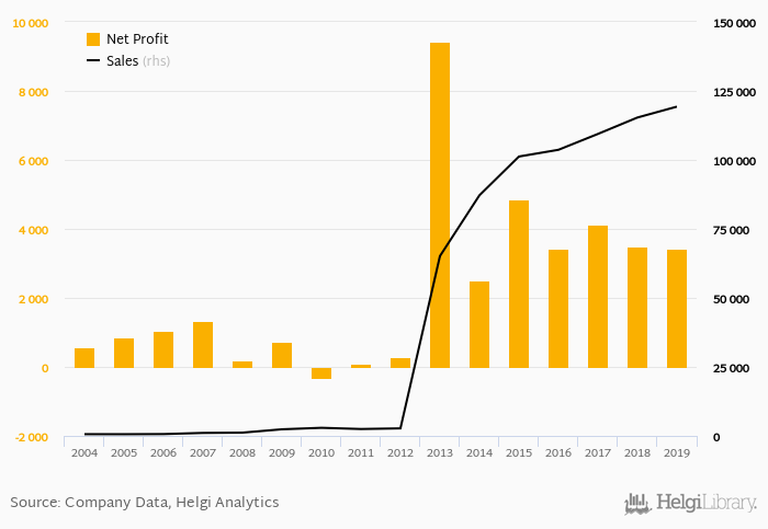 Sales have grown by 47.8% a year on average since 2009. They reached a high of SEK 119,295 mil in 2019 and a low of SEK 611 mil in 2005.
