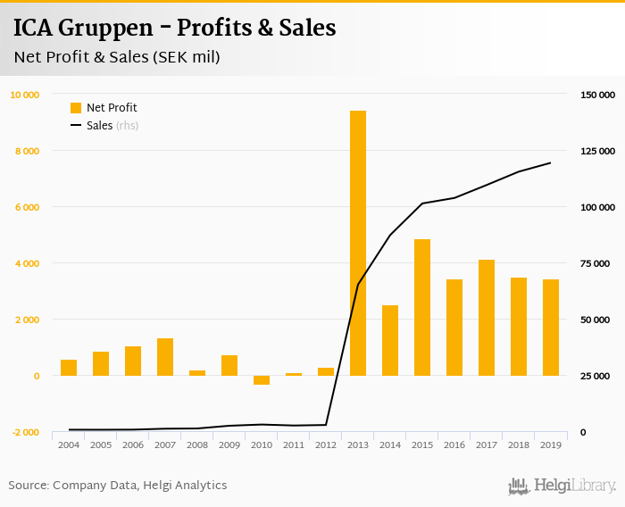 ICA Gruppen made a net profit of SEK 3,432 mil in 2019, down 1.69% compared to the previous year. Total sales reached SEK 119,295 mil, which is up 3.42% when compared to the previous year.