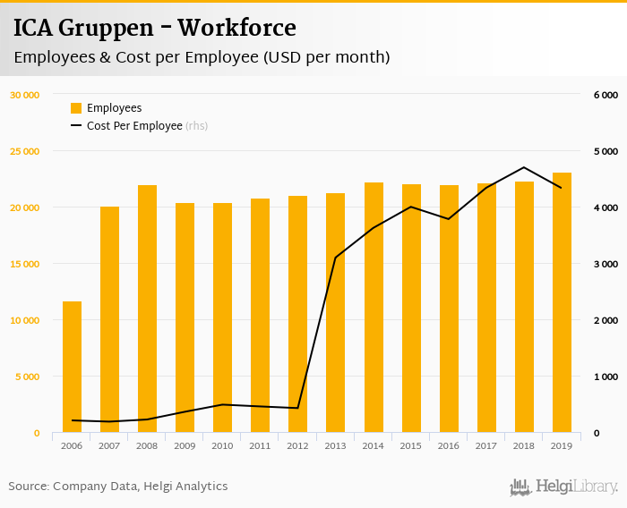 ICA Gruppen employed 23,125 employees in 2019, up 3.83% compared to the previous year. Historically, between 2006 and 2019, the firm's workforce hit a high of 23,125 employees in 2019 and a low of 11,698 employees in 2006.