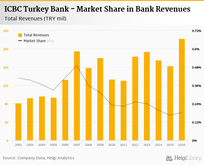 As a result, ICBC Turkey Bank accounted for 0.184% of all bank revenues generated by banks in Turkey in 2016. Historically, the bank’s market share in total revenues reached an all time high of 0.490% in 2007 and an all time low of 0.164% in 2015.