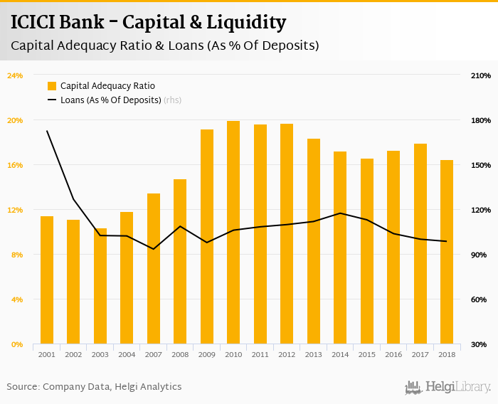 ICICI Bank's capital adequacy ratio reached 16.5% at the end of 2018, down from 17.9% compared to the previous year. Historically, the bank’s capital ratio hit an all time high of 19.9% in 2010 and an all time low of 10.4% in 2003.