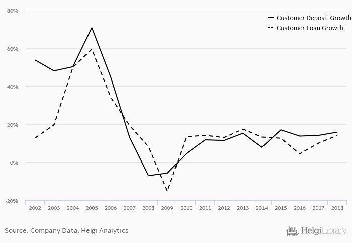 On the other hand, bank's customer deposit growth amounted to 15.8% at the end of 2018, up from 14.1% when compared to the previous year. Historically, the bank’s deposit growth reached an all time high of 70.7% in 2005 and an all time low of -7.05% in 2008. In the last decade, the average annual loan growth amounted to 10.4%.