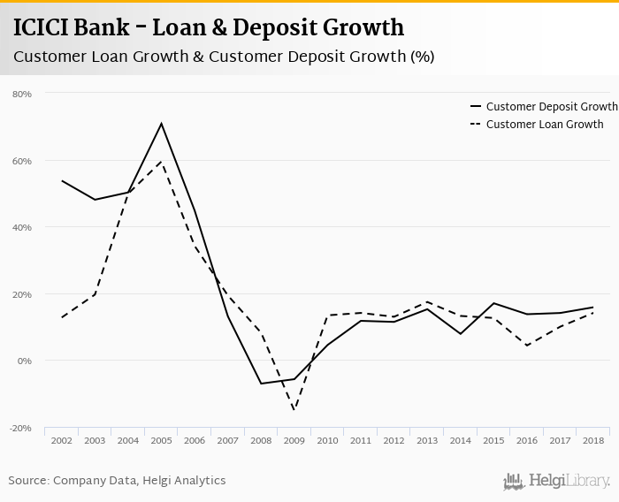 ICICI Bank's customer loan growth reached 14.1% in 2018, up from 10.0% compared to the previous year. Historically, the bank’s loans growth reached an all time high of 59.4% in 2005 and an all time low of -15.2% in 2009. In the last decade, the average annual loan growth amounted to 9.29%.