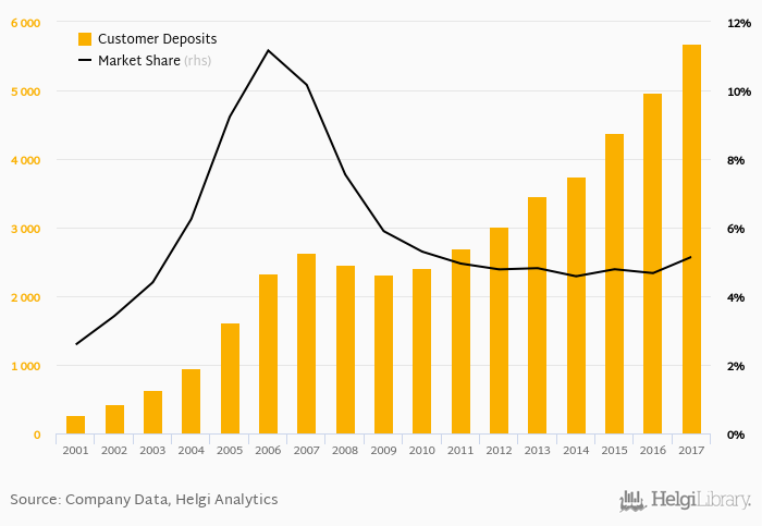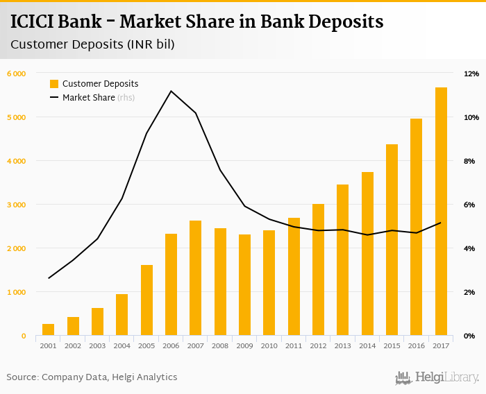 ICICI Bank accounted for 5.15% of all customer deposits taken by banks in India at the end of 2017. Historically, the bank’s market share in customer deposits reached an all time high of 11.2% in 2006 and an all time low of 2.59% in 2001.