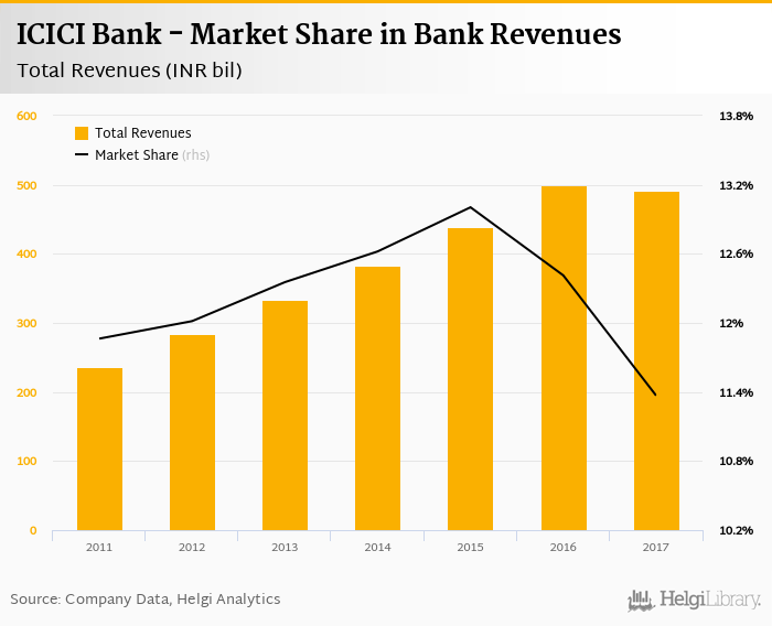 ICICI Bank generated total banking revenues of INR 491 bil in 2017, down 1.62% compared to the previous year.