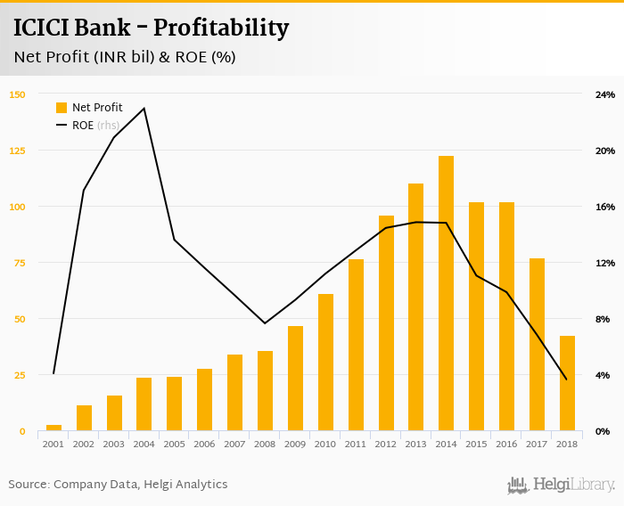 ICICI Bank made a net profit of INR 42.5 bil in 2018, down 44.8% compared to the previous year. This implies a return on equity of 3.58%.