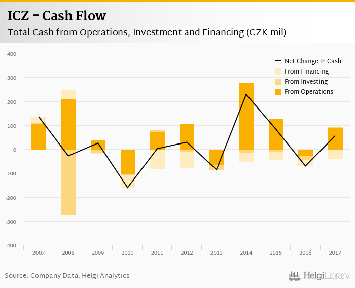 ICZ's operating cash flow stood at CZK 88.6 mil in 2017, up 422% when compared to the previous year. Historically, between 2006 - 2017, the firm’s operating cash flow reached a high of CZK 280 mil in 2014 and a low of CZK -104 mil in 2010.