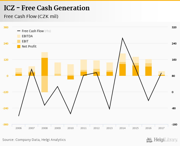 ICZ made a net profit of CZK 5.80 mil with revenues of CZK 1,071 mil in 2017, down by 91.5% and down by 26.9%, respectively, compared to the previous year. This translates into a net margin of 0.541%.