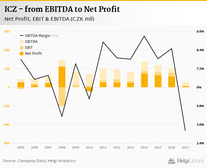 ICZ made a net profit of CZK 5.80 mil with revenues of CZK 1,071 mil in 2017, down by 91.5% and down by 26.9%, respectively, compared to the previous year. This translates into a net margin of 0.541%.