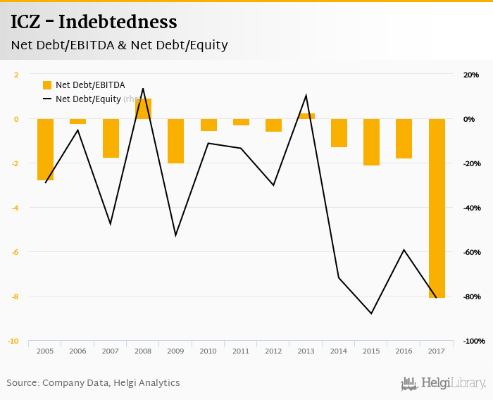 ICZ's net debt stood at CZK -274 mil and accounted for -81.0% of equity at the end of 2017. The ratio is down 21.7 pp compared to the previous year.