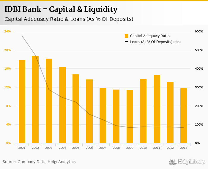 IDBI Bank's capital adequacy ratio reached 11.8% at the end of 2013, down from 13.2% compared to the previous year. Historically, the bank’s capital ratio hit an all time high of 18.7% in 2002 and an all time low of 11.5% in 2009.