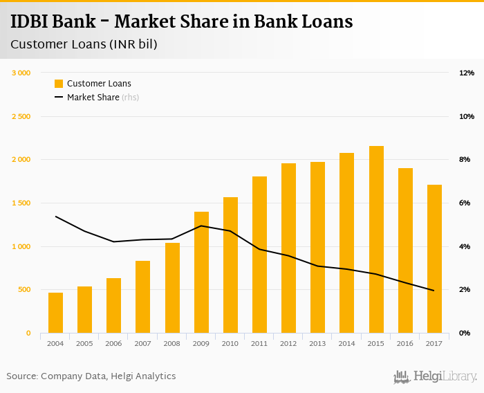 IDBI Bank's customer loans reached INR 1,717 bil in 2017, down 10.0% compared to the previous year.