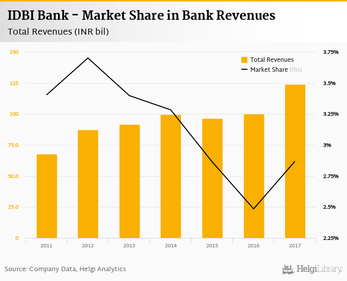 As a result, IDBI Bank accounted for 2.87% of all bank revenues generated by banks in India in 2017. Historically, the bank’s market share in total revenues reached an all time high of 3.70% in 2012 and an all time low of 2.48% in 2016.