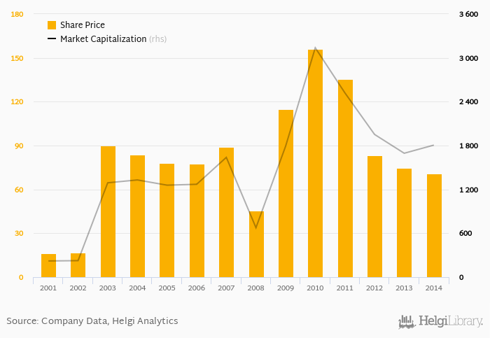Since the end of 2009, the stock has depreciated by -38.2 % implying an annual average growth of -9.19 %. In absolute terms, the value of the company rose by USD 14.8 mil.
