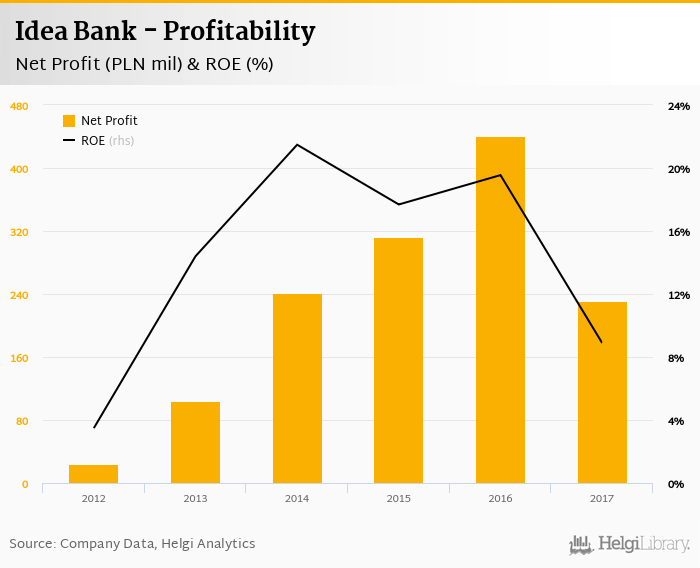 Idea Bank made a net profit of PLN 231 mil in 2017, down 47.7% compared to the previous year. This implies a return on equity of 8.89%.