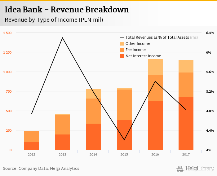 Comparing Idea Bank with its closest peers, Alior Bank generated total revenues of 5.34% of assets in 2017, Getin Holding operated with 5.72% revenue margin and Getin Noble Bank produced total income worth 2.47% of assets.