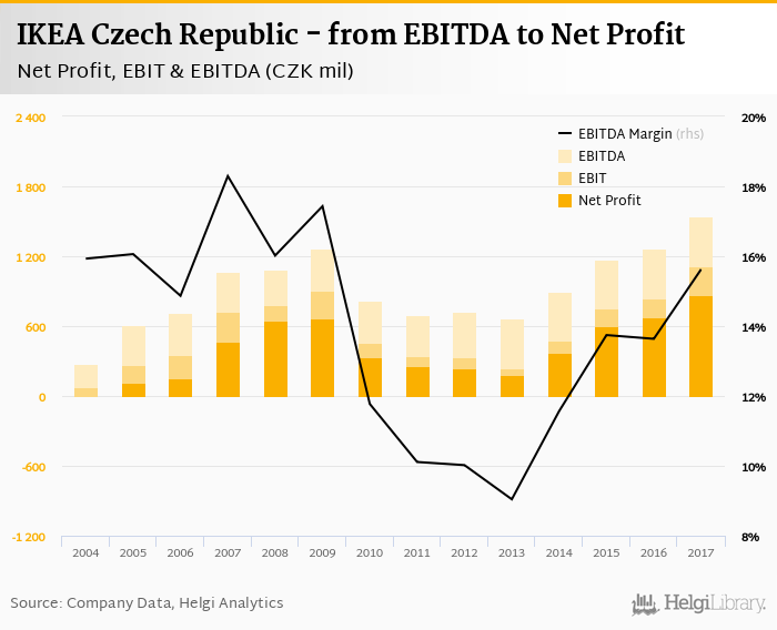 IKEA Czech Republic made a net profit of CZK 865 mil with revenues of CZK 9,893 mil in 2017, up by 28.2% and up by 6.32%, respectively, compared to the previous year. This translates into a net margin of 8.74%.