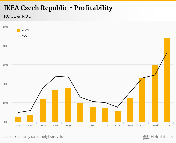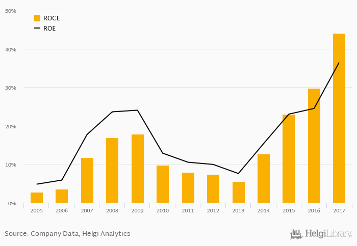 The result implies a return on equity of 36.5% and a return on invested capital of 44.0% in 2017. That is compared to an average of 21.4% and 23.0% over the last five years.