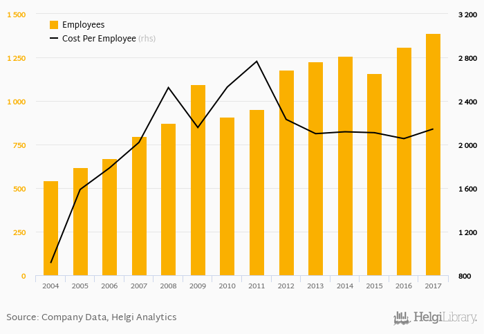 Staff cost represented of sales in 2017, 0 pp higher than a decade ago.