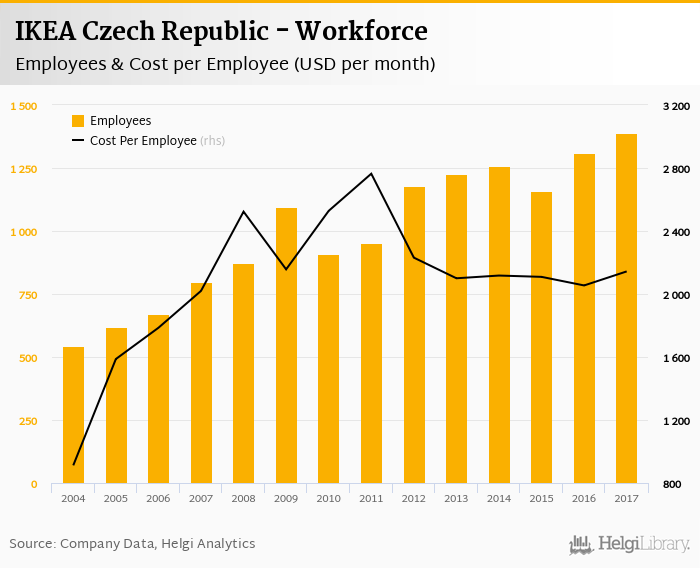 IKEA Czech Republic employed 1,388 employees in 2017, up 5.95% compared to the previous year. Historically, between 2004 and 2017, the firm's workforce hit a high of 1,388 employees in 2017 and a low of 544 employees in 2004.