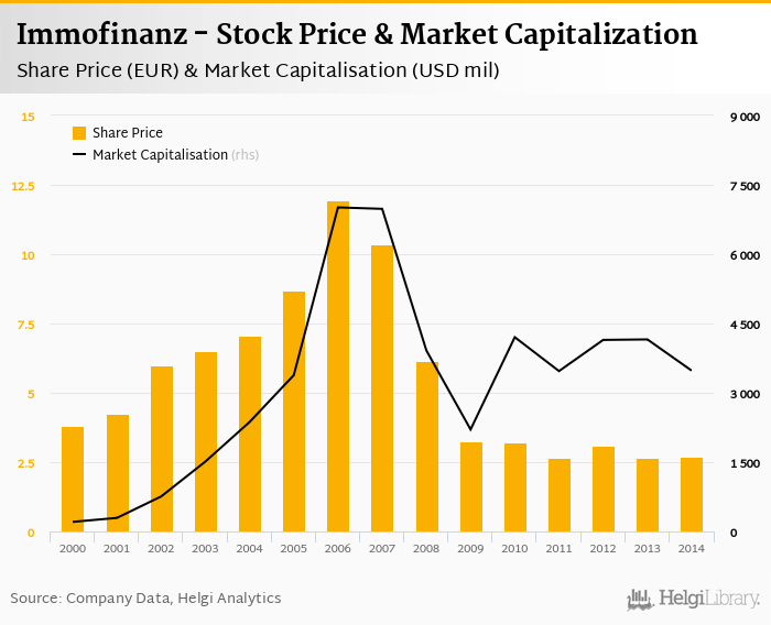 Historically, between 2000 and 2014, the Immofinanz’s stock price reached a high of EUR 12.0 in 2006 and a low of EUR 2.66 in 2011.
