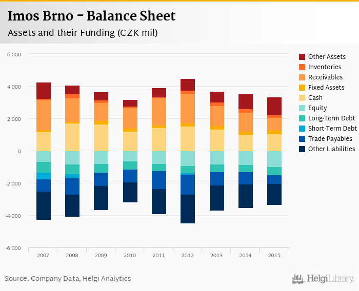 Imos Brno's total assets reached CZK 3,340 mil at the end of 2015, down 5.53% compared to the previous year.