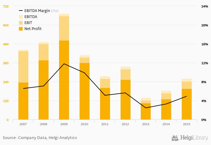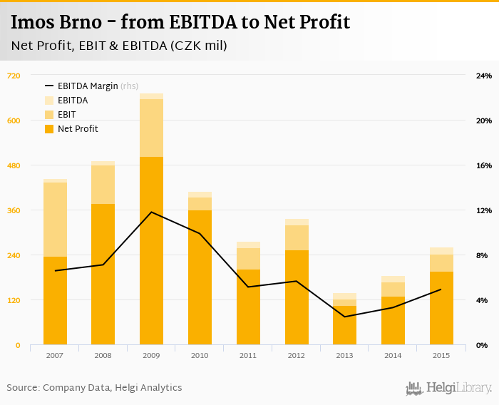Imos Brno made a net profit of CZK 196 mil with revenues of CZK 5,329 mil in 2015, up by 50.9% and down by 5.12%, respectively, compared to the previous year. This translates into a net margin of 3.68%.