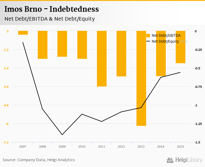 Imos Brno's net debt stood at CZK -542 mil and accounted for -0.560 of equity at the end of 2015. The ratio is up 0.068 pp compared to the previous year.