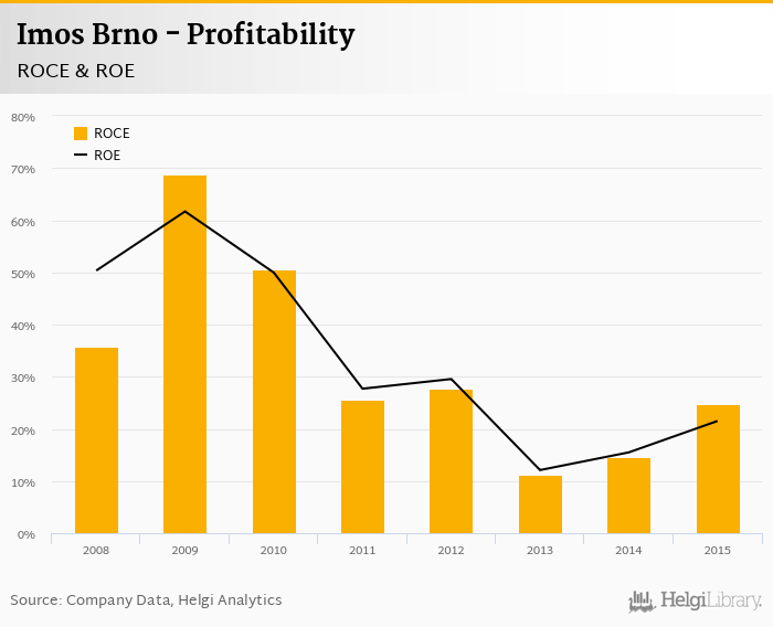 Imos Brno made a net profit of CZK 196 mil in 2015, up 50.9% compared to the previous year. Historically, between 2007 and 2015, the company's net profit reached a high of CZK 502 mil in 2009 and a low of CZK 105 mil in 2013.