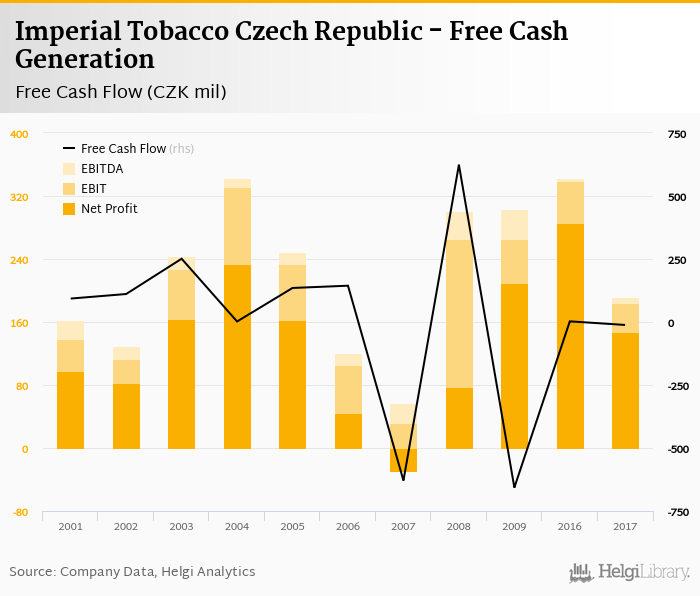 Imperial Tobacco Czech Republic made a net profit of CZK 147 mil with revenues of CZK 11,106 mil in 2017, down by 48.5% and down by 3.07%, respectively, compared to the previous year. This translates into a net margin of 1.32%.