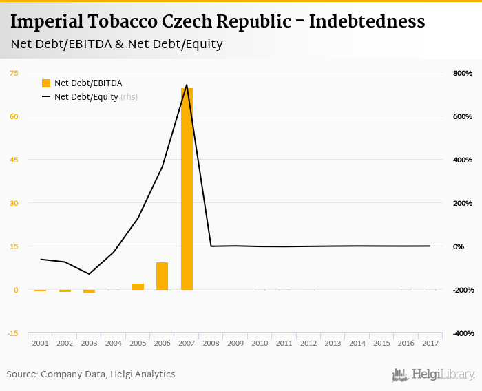 Imperial Tobacco Czech Republic's net debt stood at CZK -33.4 mil and accounted for -1.35% of equity at the end of 2017. The ratio is up 0.379 pp compared to the previous year.