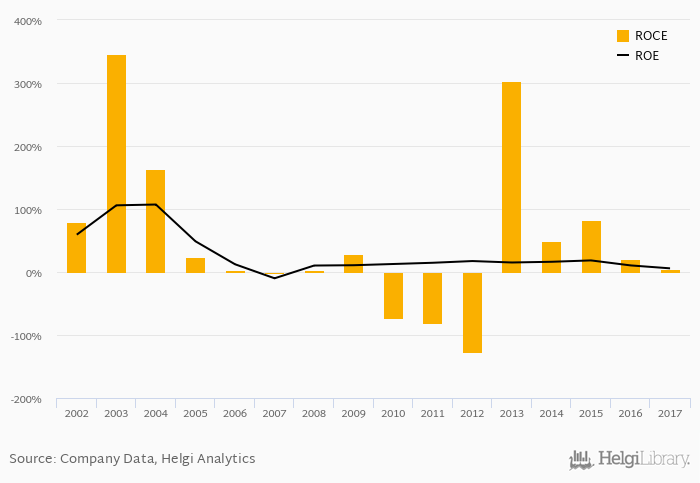 The result implies a return on equity of 5.78% and a return on invested capital of 5.33% in 2017. That is compared to an average of 13.2% and 91.8% over the last five years.