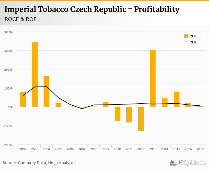 As far as Imperial Tobacco Czech Republic's peers are concerned, British American Tobacco Czech Rep. generated ROE of 43.4% and ROCE of 5.56% in 2017. Philip Morris Czech Republic's profitability reached 40.7% and 68.2%, respectively.
