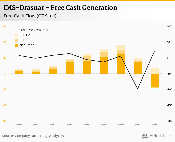 The company generated cash, defined by a sum of net profit and depreciation, of CZK -13.7 mil or -3.46% of sales. When investments are excluded, free cash flow reached CZK 21.7 mil, or 5.50% of sales in 2018.
