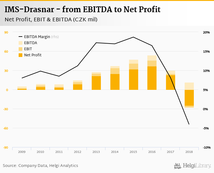 IMS-Drasnar made a net profit of CZK -25.0 mil with revenues of CZK 395 mil in 2018, down by 209% and up by 5.91%, respectively, compared to the previous year. This translates into a net margin of -6.32%.