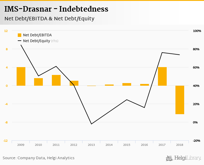 IMS-Drasnar's net debt stood at CZK 100 mil and accounted for 73.5% of equity at the end of 2018. The ratio is down 2.43 pp compared to the previous year.