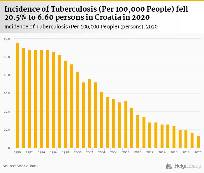 Croatia has been ranked 165th within the group of 176 countries we follow in terms of incidence of tuberculosis per 100,000 people, 30 places below the position seen 10 years ago.