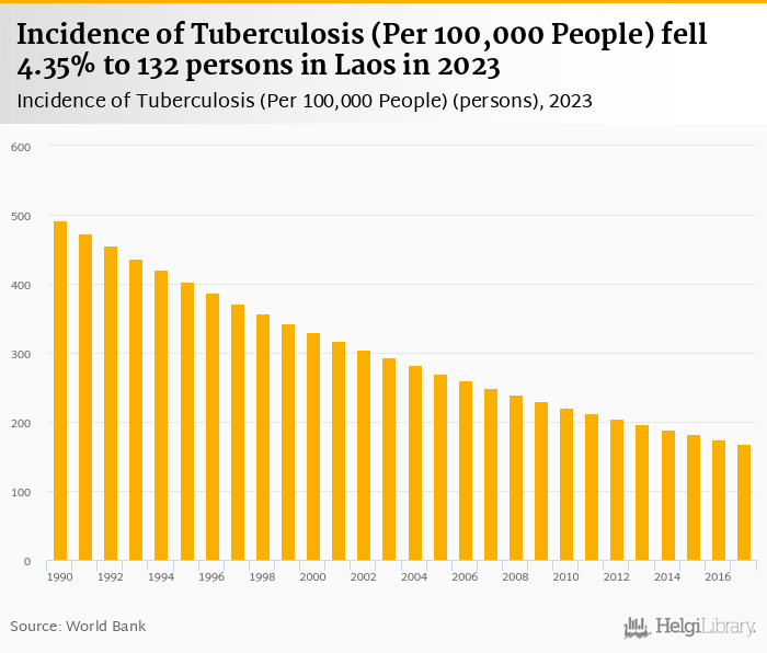 Incidence of tuberculosis per 100,000 people fell 4.35% to 132 persons in Laos in 2023, according to World Bank / WHO.