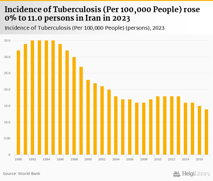 Incidence of tuberculosis per 100,000 people rose 0% to 11.0 persons in Iran in 2023, according to World Bank / WHO.