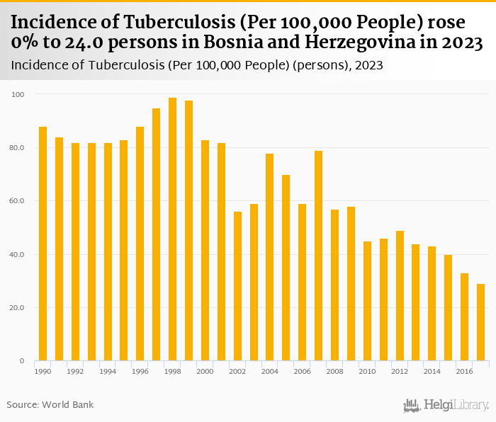 Incidence of tuberculosis per 100,000 people rose 0% to 24.0 persons in Bosnia and Herzegovina in 2023, according to World Bank / WHO.