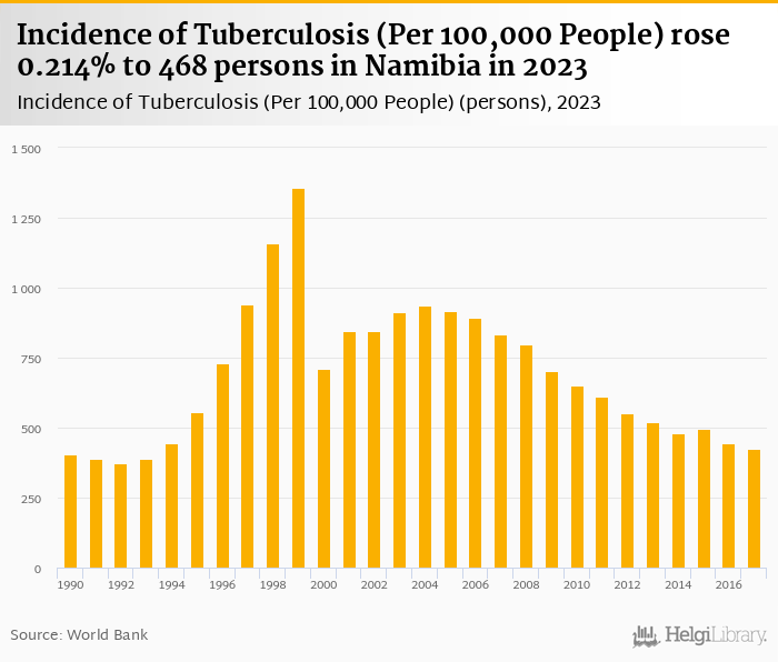 Incidence of tuberculosis per 100,000 people rose 0.214% to 468 persons in Namibia in 2023, according to World Bank / WHO.