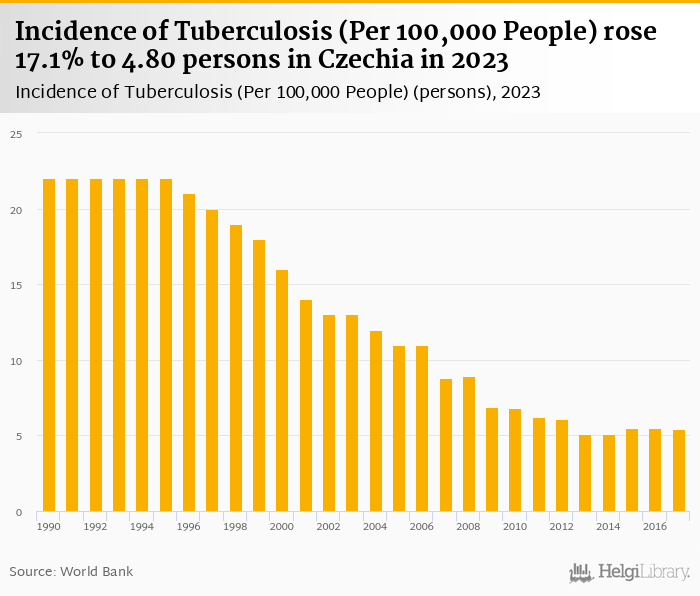Incidence of tuberculosis per 100,000 people rose 17.1% to 4.80 persons in Czechia in 2023, according to World Bank / WHO.